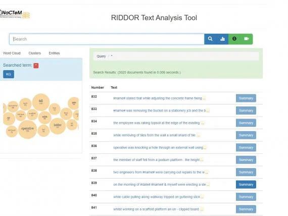 As its name suggests, the RIDDOR Text Analysis Tool is based on the accident reports submitted to HSE under the Reporting of Injuries, Diseases and Dangerous Occurrences Regulations (RIDDOR) 2013. It uses natural language processing and machine learning to perform semantic searching on accident and incident textual data. It’s available to view on the NaCTeM website (where there is also a helpful video).
